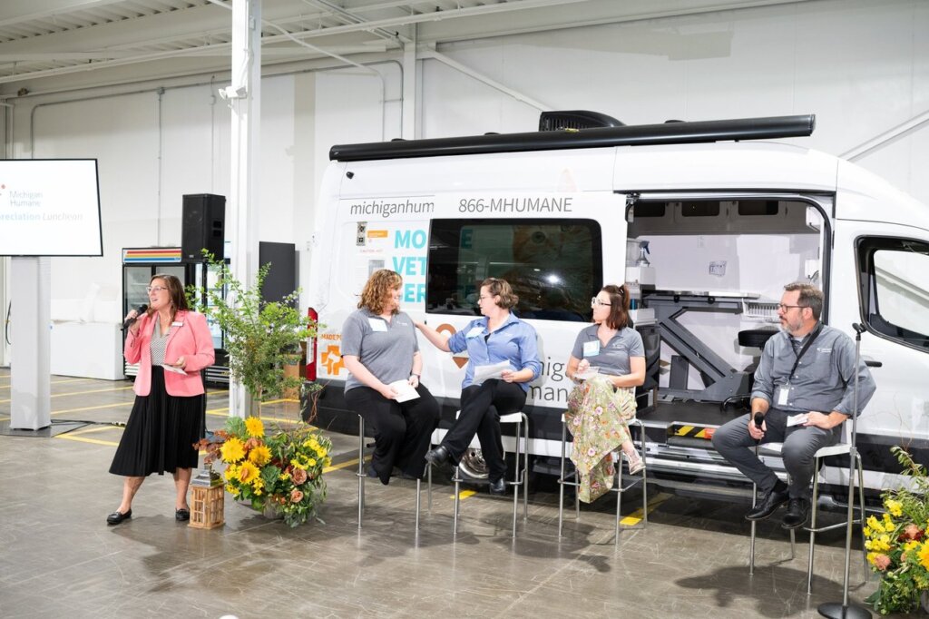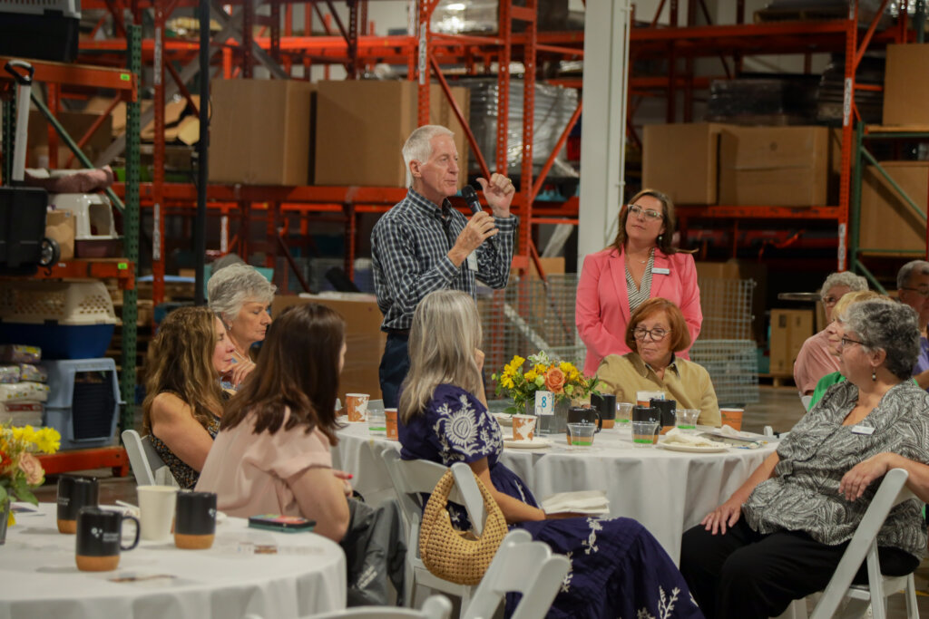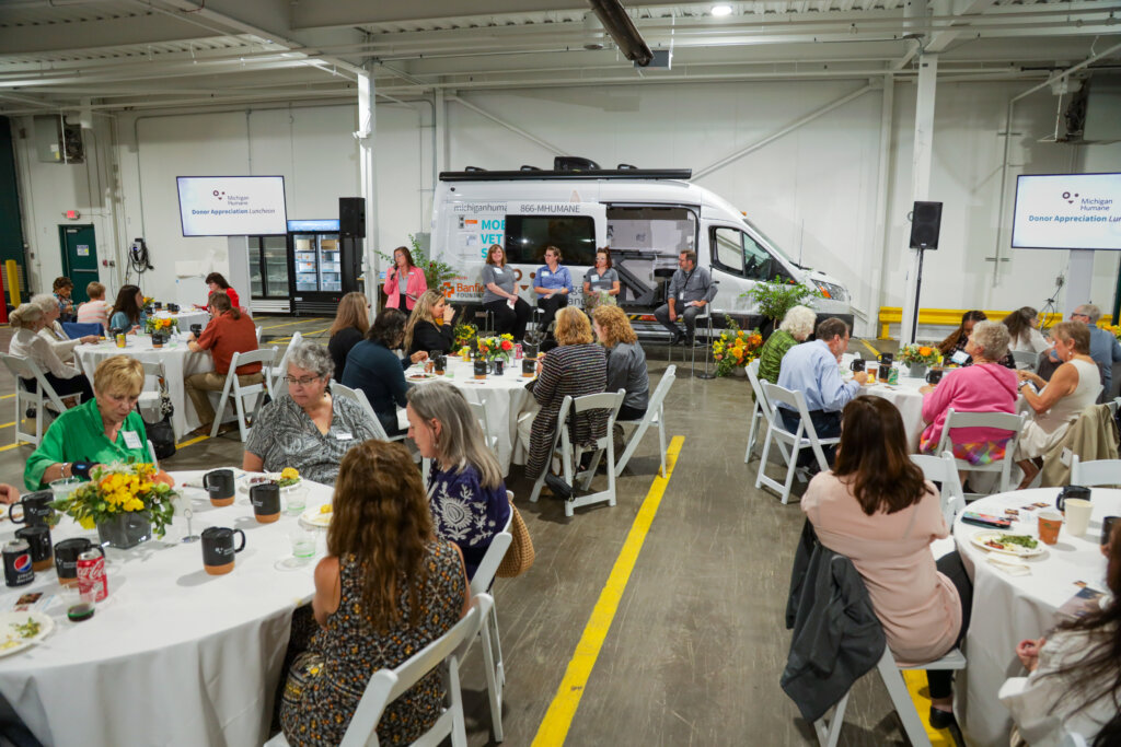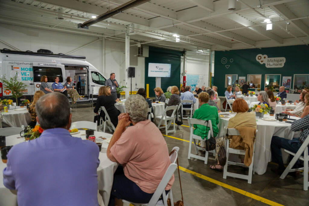On August 23 we held a luncheon at our Caplan Family Pet Food Pantry to celebrate and show appreciation for members of our Legacy Society. Donors were welcomed in for lunch, a presentation by members of the Leadership team, and an open time of Q&A to engage in conversation about the ways that our programs are working to build a more humane community. Attendees heard updates about the recent effort to expand our pet food pantry distribution into more neighborhoods across Detroit; our growing Community Vet program, which now serves more pets in their homes thanks to the recent donation of a mobile vet unit from the Banfield Foundation; and our farm animal rescue work, as we approach the two-year anniversary of the opening of Abraham Ranch.
